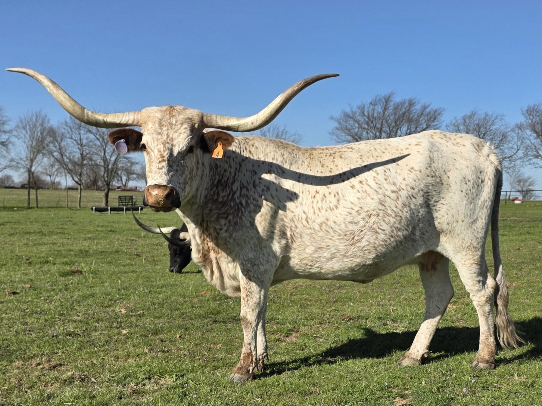Meet Pearl Snap, beautiful Texas Longhorn with a sleek, speckled white coat that gives her a refined and graceful look. Her wide, symmetrical horns curve elegantly outward, showcasing the classic Longhorn style. She has a calm and confident presence, with dark markings around her eyes that add depth to her expression.