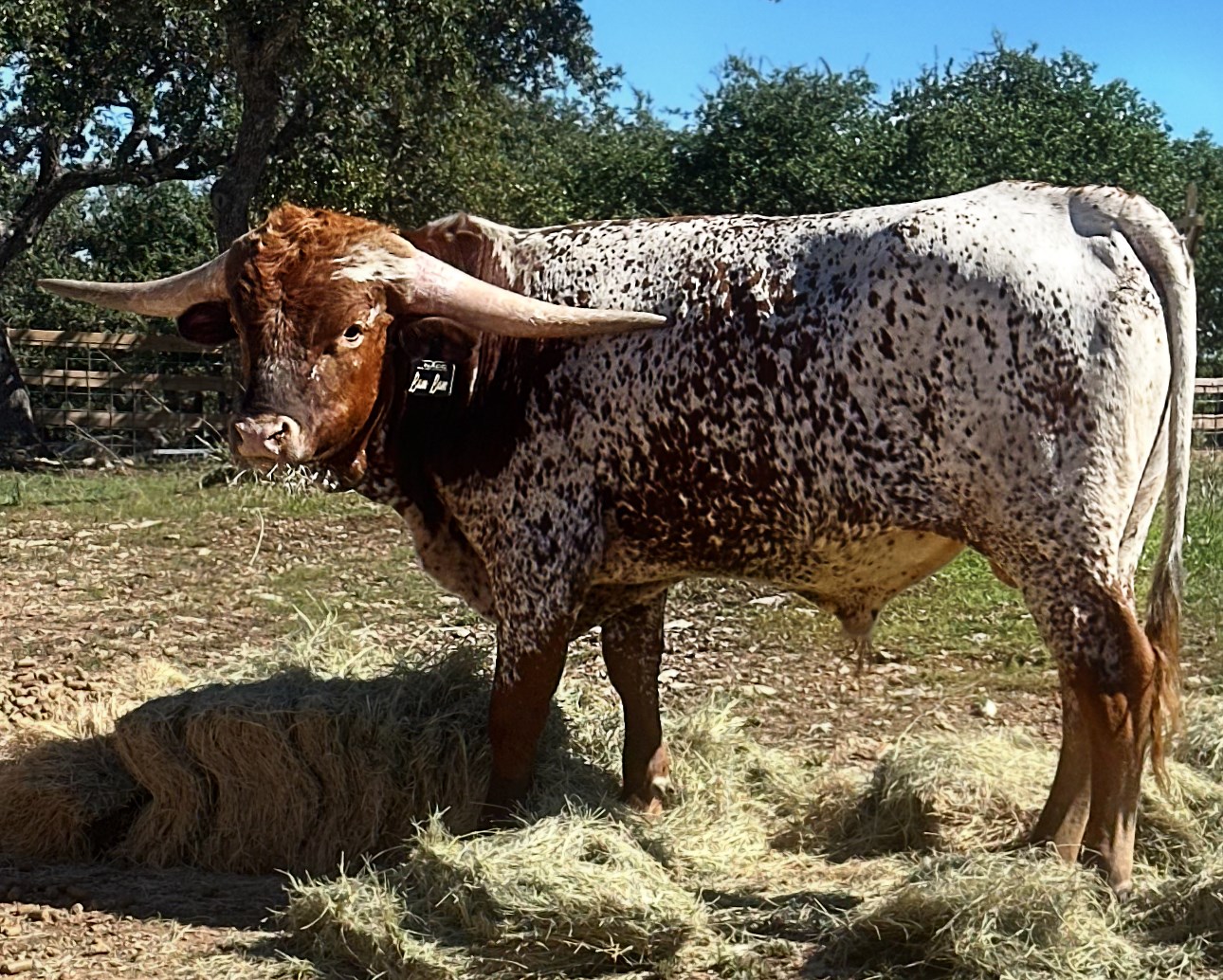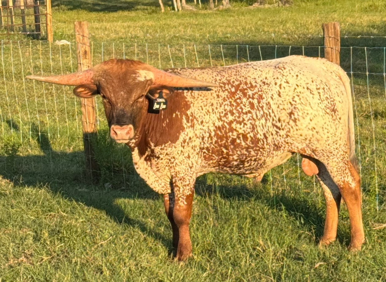 This young bull has some great horn growth in the right direction, lots of color and a all star pedigree. This is one of the oldest bull calves from the first out cross breeding on Formal Attire. This young bull combines 100" Horseshoe J Example "402", Tempter, 100" Pacific Cowboy, the outstanding RC Pacific Mermaid who produced the 101" SHR Majestic Mermaid when crossed with "402". Also, we see how well TEXACO is doing at Siller Longhorns, the Tejas Star crossed on Formal Attire is magic! This is a serious pedigree and no one will have pedigree like his in the industry!
