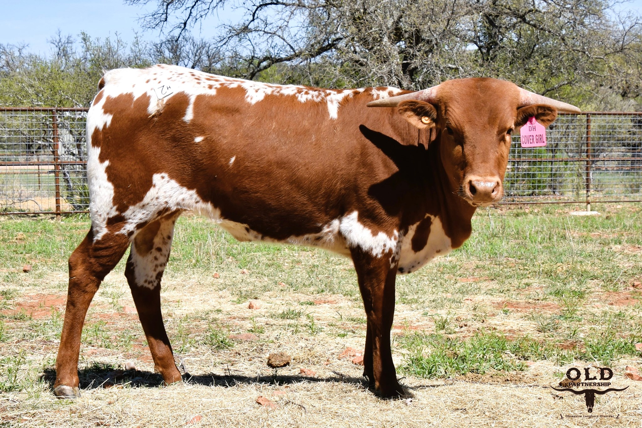 Sired be the undefeated DH Hired Hand, this beautifully marked girl is one we love to see roaming in our pasture, she has PERFECT conformation and her horns are setback with a twist. On the maternal side she goes to the DH Red Temptation cow that produced 3 over 90"TTT cows with different sires. Her grandsire on top is non other than HL Hire Ground. Love this girl and her genetic makeup and excited about her future with us at the OLD Partnership.