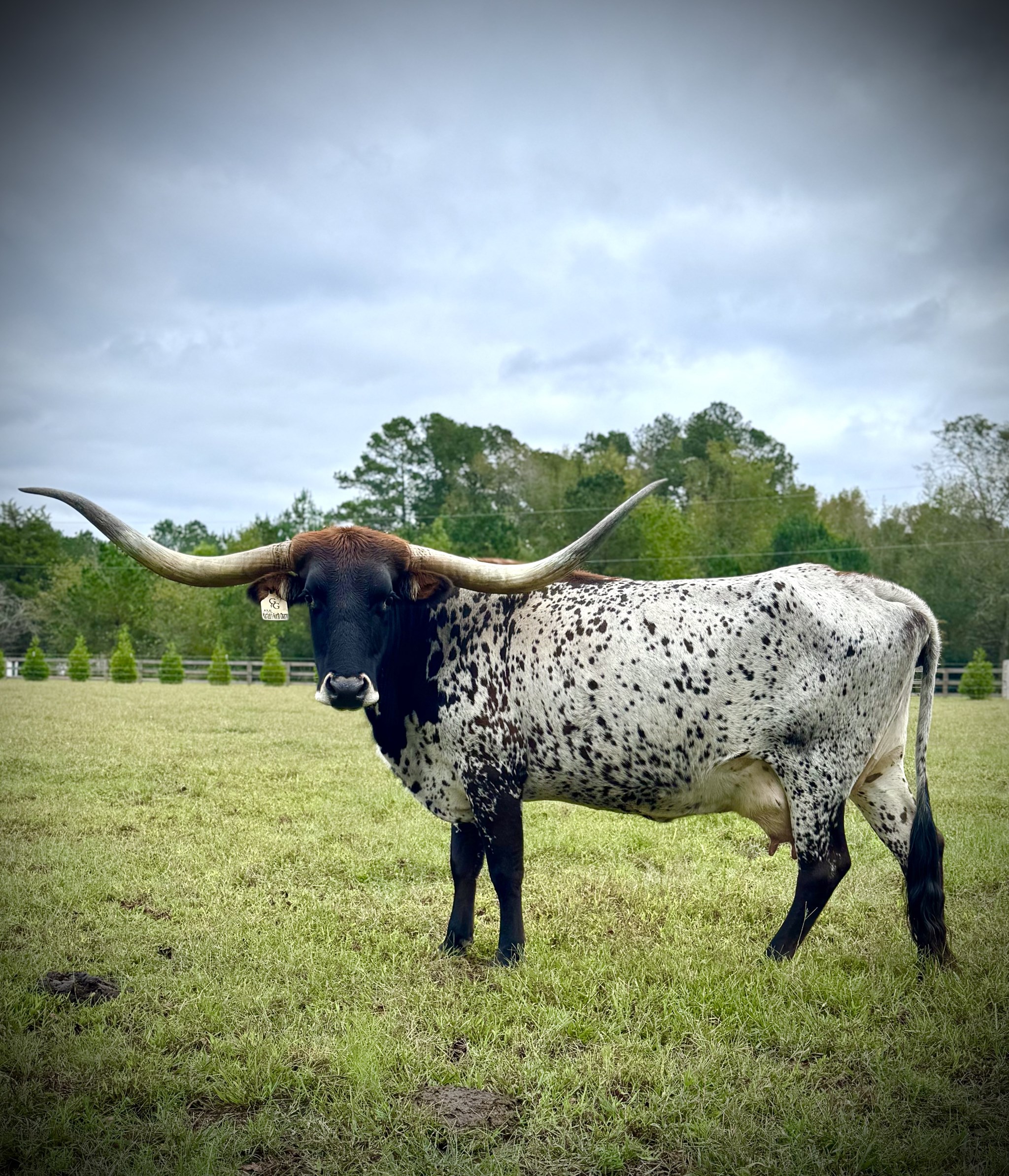 Beautiful Hubbells 20 Gauge daughter we acquired from G&G Longhorns. She’s a solid foundation cow with great color and temperament. Bred to KCCI Hangin On 2 U who’s at 94” expected to exceed 100” TTT
